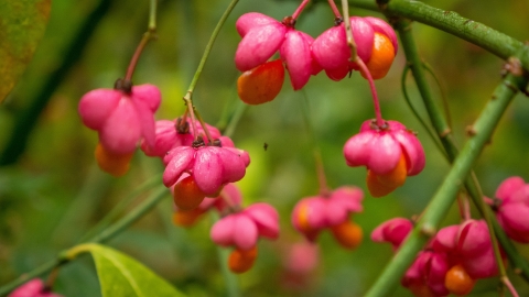 Spindle berries are unmissable with their clashing colours of shocking pink fruits bursting open to reveal orange seeds! These provide food for mice, birds and even red foxes. Spindle often grows in hedgerows, alongside other trees and shrubs such as dogwood, guelder rose, hazel and hawthorn.