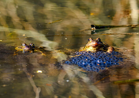 A common frog (Rana temporaria) in a pond with spawn. Picture: Luke Massey/ 2020Vision
