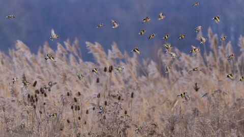 Over winter, small birds like goldfinches form roving flocks that forage together. The bold red mask, golden back, and bright yellow wings of the goldfinch make it one of our most striking birds. If the weather stays cold you can see large flocks of up to 100 birds (their collective name is a ‘charm’) sweeping over farmland such as our Wells Farm reserve near Little Milton but, as the weather warms, these groups break up as individuals start breeding.