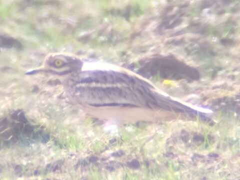 An unmistakeably odd-looking bird. They're sandy brown, with darker streaking on the back and breast. There is a pale, whitish bar across the wing. The most distinctive features are the long yellow legs and large, prominent yellow eyes. They also have a heavy, yellow beak with a black tip.